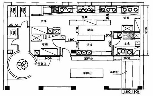 不能设计为独立的工作间时,也要有相对独立的功能区域。可以采用无形的隔断,例如用冰柜、碗柜、水池排列形成墙,利用设备围拢形成工作区间。结合实际情况灵活应用,可以,增加自然的采光亮度和通风效果,使工作间宽敞明亮。即使榴莲网站视频处在没有自然采光的位置,减少隔断,或用透明度好的玻璃隔断,也有利于照明和视距,节省照明用电便于通行、协调和管理。图5-6是一个小餐馆的榴莲网站视频的设计图纸,由于使用的设备比较多,采用了部分无墙隔断设计。为保持卫生洁净,在主食加工间、凉菜间设计了隔断,凉菜间设计了凉菜出餐口,便于出餐,也保证了清洁卫生。凉菜间隔断可阻挡油烟废气、清洁美观,也隔断了客人从凉菜出餐口向内观望的视线。消洗、传菜间采用了无墙隔断,使功能区域分割清楚,又便于配合工作。