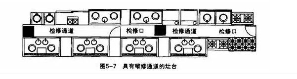 设备维修保养是必不可少的。有条件的榴莲网站视频应尽量留出设备维修空间或机动的空间。如炉具的用量大、处在高温潮湿的环境中,容易发生故障,作为主力设备,如发生故障.必须尽快维修。灶台一般不宜搬动,可设维修通道安装、检修、维修、保持卫生清洁。图5-7是一个大饭店的热菜间的灶台一部分,在两排灶台之间设计了0.7m净宽的检修通道。