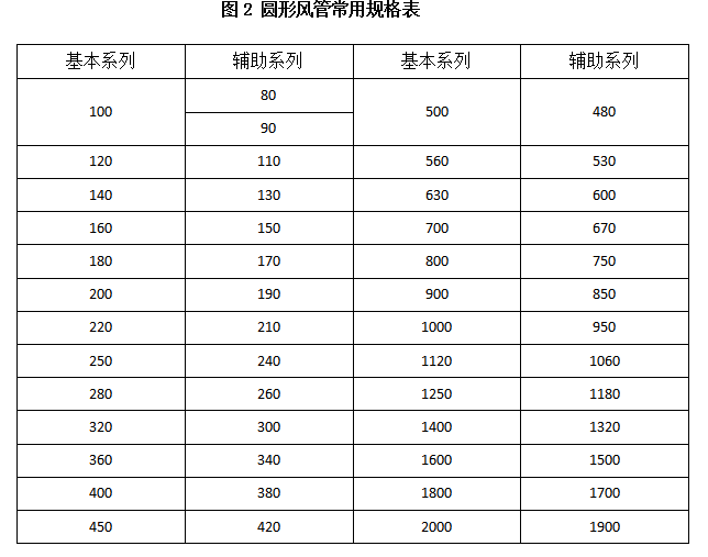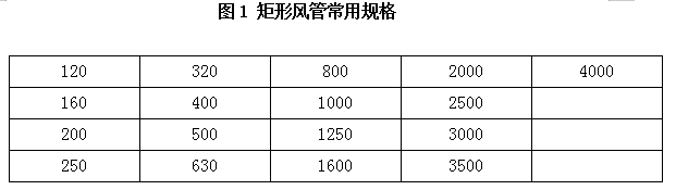 在安装条件允许的情况下,在实际设计制作管道时,还需要根据需要选择合理的结构尺寸。根据《通风管道技术规程》(JCJ141-2004)的规定,矩形风管的边长与圆管直径应尽量选用常用规格,见表1和表2。矩形风管长边与短边之比不宜大于4:1。金属矩形风管宜以外边长(或外径)为标注尺寸;非金属矩形风管宜以内边长(或内径)为标注尺寸。圆形风管应优先选用表2中的基本系列。以下各表选自《通风与空调工程施工质量验收规范》(GB50243-2002)