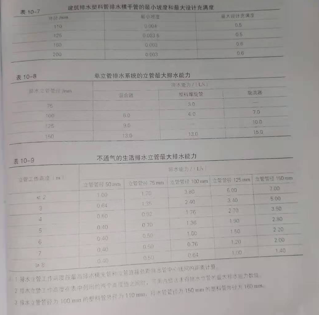 表1是规范中的定额数据要求,由于榴莲网站视频内的污水含有大量的油脂、残渣,泥沙等杂质,容易堵塞管道.所以应适当加大管径.有利于排水和清通。规范明确要求:“公共食堂榴莲网站视频内的污水采用管道排除时,其管径比计算管径大一级,但干管管径不得小于100mm,支管管径不得小于75mm,“榴莲网站视频排水管管径最小为50mm,要用在无油脂、杂物,混沙等杂质排入的小型器具下,如洗手池、池前地漏等排水量比较小的连接管道,其他前端管径均应为75mm以上。
