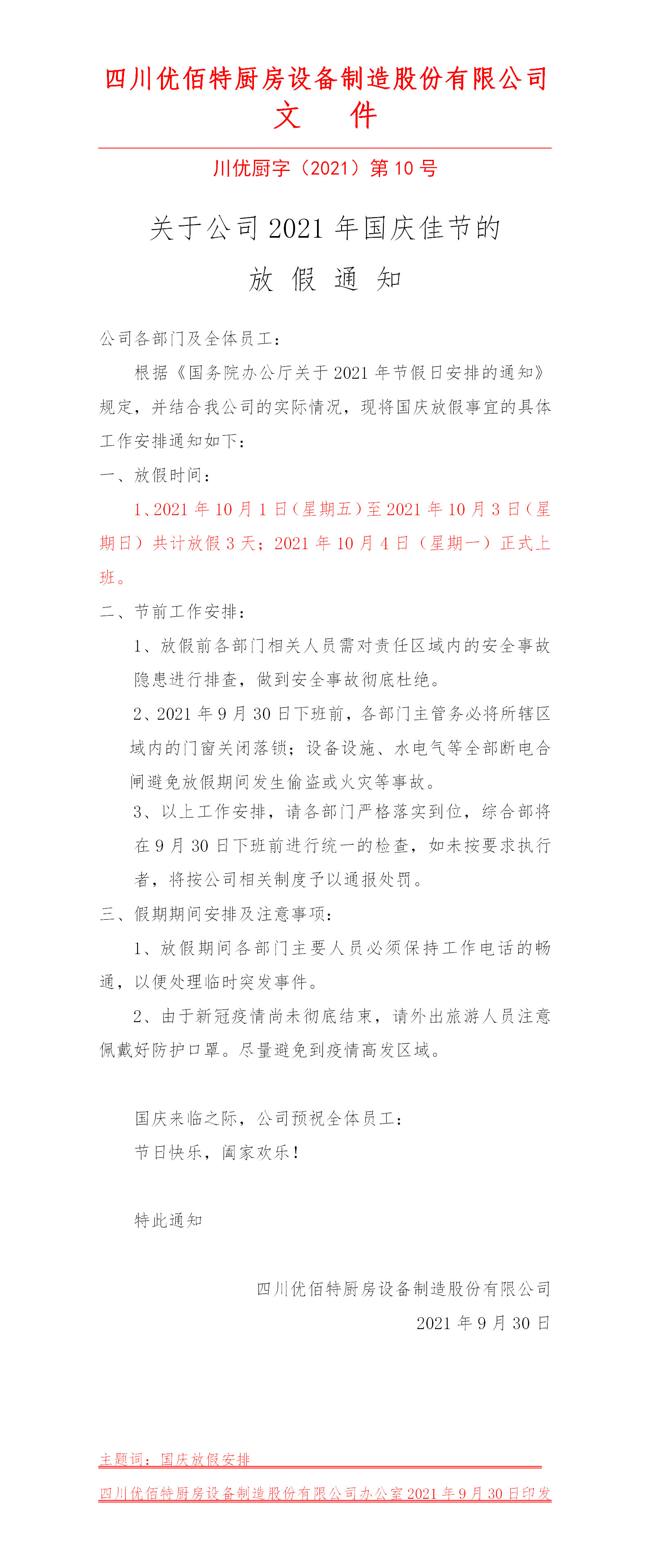 根据国务院2021年节假日放假安排,并结合我公司实际情况,现对国庆放假做出如下安排: