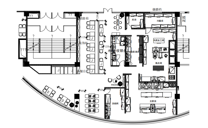 使用的灶具少,灶具主要是用大锅灶煮面、熬粥,只需一两眼炒灶用来制作主食配料,或用来煮零点的面条、饺子;使用的机械设备多,如和面机、压面机、包子机、菜焰机、搅拌机等;蒸、煮、烤、炸、煎设备用得多,蒸饭柜、夹层锅、烤箱、电炸 锅、电饼铛等;主食加工间与副食加工间特点不同,主食的米饭、馒头、包子、饺子等食品大多是批量制作,批量蒸煮生产。所以,除煎炸食品外,生制与熟制可以分开区域设置。熟制区需要出餐台,生制区需要机械设备、工作台、及原料运送,传餐通道要有一定的宽度,通道要设置合理。由于经营方式、餐品类别、加工工艺、出餐产量大小差异较大,主食加工间布局与饭店榴莲网站视频设计自有特点。