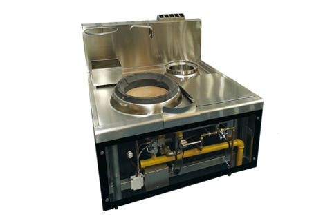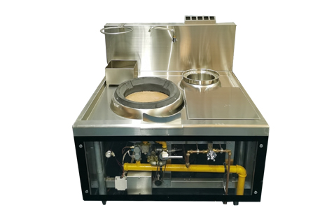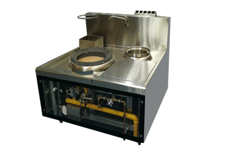 6、双连体比例阀,带稳压阀,风气联动,全铜管气制链接。加重加深尾撑,铜管上水,十字水阀,带笊篱架凉水盒,调味版。全钢把手。