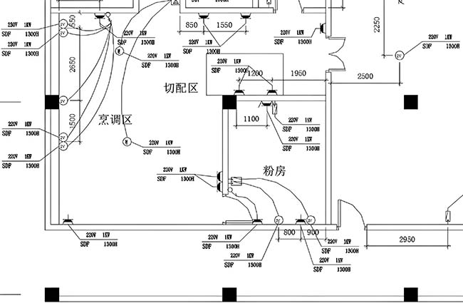 5、将电源插座布局在动力设备周边,电源插座的安裝高宽比根据厨具厂家规定安裝,其电源插座为安全性防潮插座防水盒暗电源插座,因动力配电箱负载容积很大,因此 选用放射性式配电设备。配电柜部位应安裝在有利于检修查询的地区而且避开自来水点。
