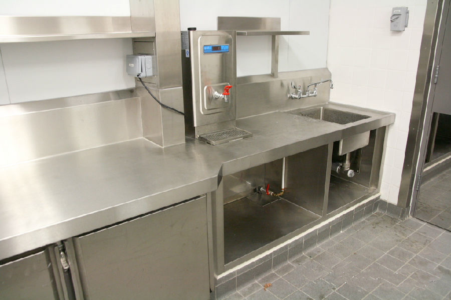 依然是一流的现场无缝焊接工艺,台面非常平整,对土建(地台施工),现场焊接工艺,调理台的制造工艺要求非常高。工作台的背板用大弧度L型设计,避免藏污纳垢,容易清洗。
