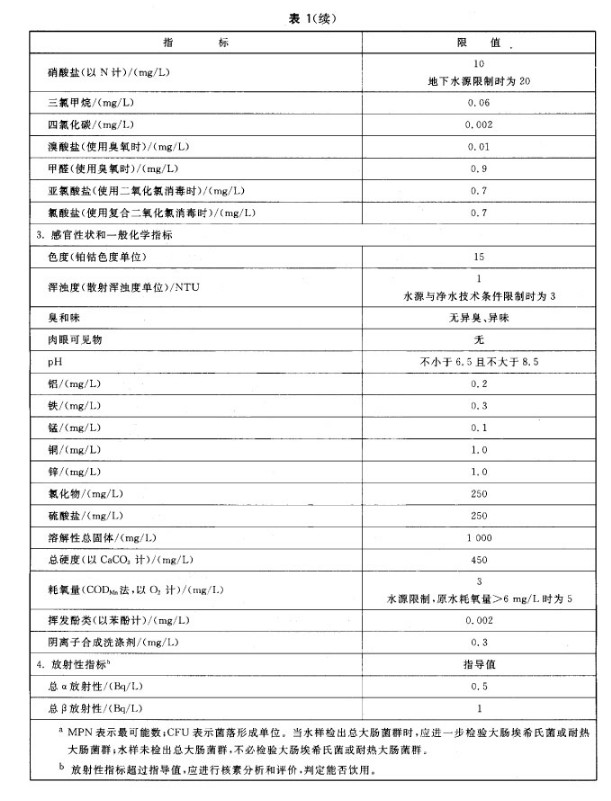 农村小型集中式供水和分散式供水的水质因条件限制,部分指标可暂按照表4执行,其余指标仍按表1、表2和表3执行。